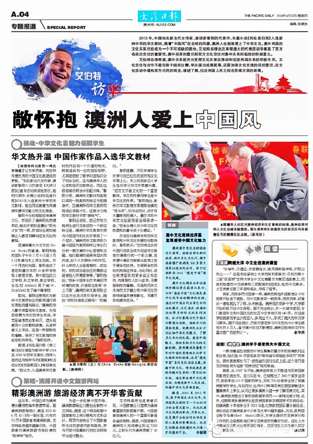 2013年,中国知名新生代女作家、演讲家黎阳的代表作、长篇小说《何处是归程》入选新州中学的华文教材。随着“中国风”在全球的风靡,澳洲人也渐渐爱上了中华文化。澳中两国的文化关系已经成为一个不可或缺的部分。艾伯特总理此次率领庞大的代表团访华彰显了双方各层次交往的重要性,澳中应深刻意识到双方文化交往对澳中关系所起到的积极意义。