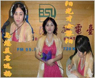黎阳:所以我很感谢我的母亲。对我影响最大的是我的母亲。你想想,她这样的规定下来,先是一种强制,或是不愿意,最后就变成了一种习惯。所以说什 主持人:(美扬)我们知道你唱歌唱得非常好,能现在给我们唱两句吗? (林波)你这样吧,才女嘛,出道题考考你。先给听众朋友们说下,事先没有同黎阳沟通过。 黎阳:我心里好大的压力,今天一定要重申,我是直接先到直播间来,不知道他们要问我什么。我是今天中午才赶回来,坐在这里,一片茫然。 主持人:用散文的体裁,把今天进直播间的一些感受写出来。 黎阳:首先说我是阳光才女,我进来时,发觉两张更加阳光的脸,那就是这两位主持人,我都没想到……进了演播间,我真的想说点感受,第一个是新闻的严谨性,在这里完全能体现出来,还有就是诗意的流动性。我们三人在这里交谈,非常愉快。我们感觉半个小时都不够,我们很想表达更多的东西,所以语速不经意间自然加快了。其实我们三个都很年轻,我们都很阳光,本质上我们都是浪漫的,尽管我对你们俩没有深入地了解。可是我从你们的眼神中已经看出来,就像说诗意地存在永远是人类存在的一种方式。 主持人:谢谢黎阳老师,在节目的最后,你最大的愿望是什么? 黎阳: 我希望向世界传播优秀的中国文化, Spread the Chinese culture throughout the world………