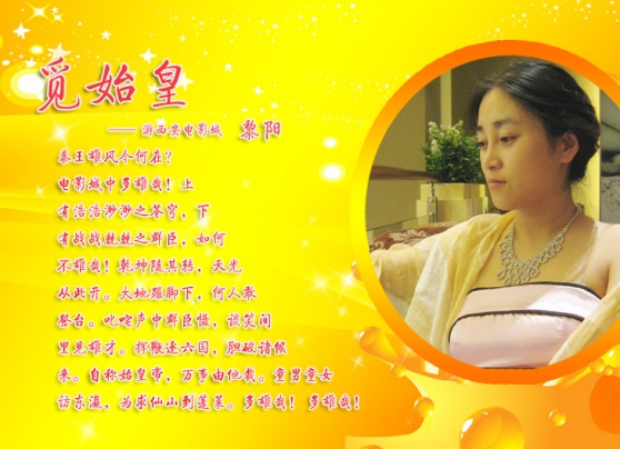 秦王雄风今何在?电影城中多雄哉!上有浩浩渺渺之苍穹,下有战战兢兢之群臣,如何不雄哉!乾坤随其转,天光从此开。大地蹑脚下,何人敢登台。叱咤声中群臣慑,谈笑间里见雄才。挥鞭逐六国,胆破诸候来。自称始皇帝,万事由他裁。童男童女访东瀛,为求仙山到蓬莱。多雄哉!多雄哉!